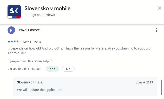 Android Playstore mi pise, ze: Aplikacia nie je dostupna, lebo bola vytvorena pre starsiu verziu Androidu. Mam Android 14. Pridavam aj screenshot z Google Reviews, kde 6.6.2025 slubili update pre Android 15. Funguje to niekomu na Android 14?