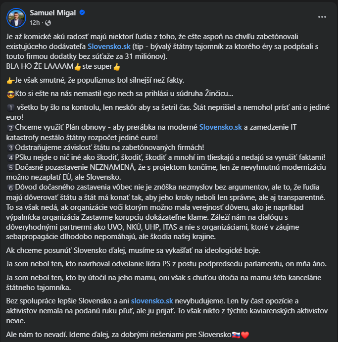 Keď čítam tieto (aj historicky) kauzy, je mi smutno a zároveň chcem vyzdvihnúť všetky expertky a expertov na MIRRI, NASES a iných podriadených organizáciach, ktorí denne pracujú na projektoch a procesoch, dávajú tomu expertízu a srdiečko, snažia sa to robiť najlepšie ako vedia a zvládajú tie politické tlaky, manažérsky zlé rozhodnutia a celú tú kultúru štátnej správy.