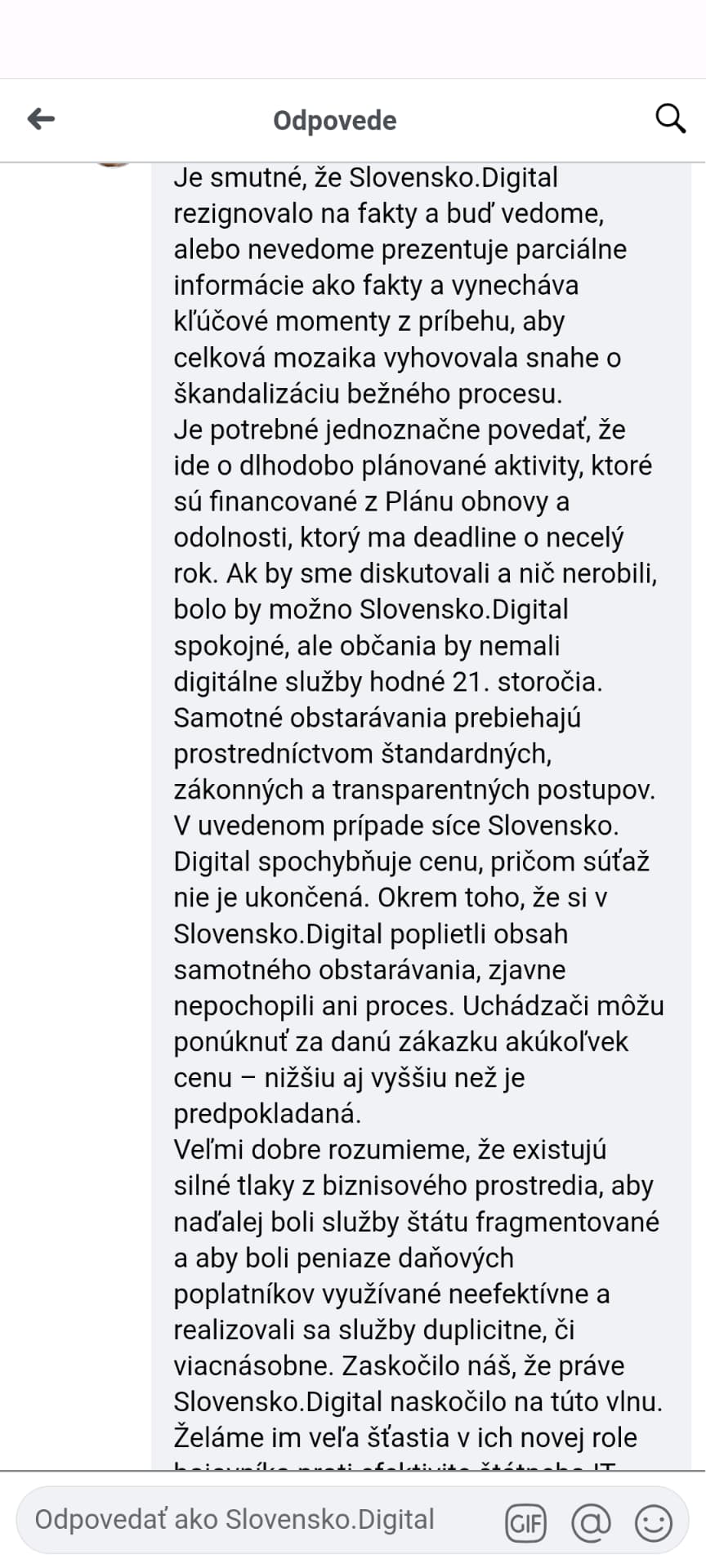 Národná agentúra pre sieťové a elektronické služby (NASES) reaguje na kritiku občianskeho združenia Slovensko.Digital, ktoré spochybňuje cenu a proces obstarávania. NASES zdôrazňuje, že ide o dlhodobo plánovaný projekt financovaný z Plánu obnovy, ktorý musí byť realizovaný v zákonných a transparentných postupoch. Uchádzači môžu ponúknuť akúkoľvek cenu, nižšiu alebo vyššiu než predpokladaná.